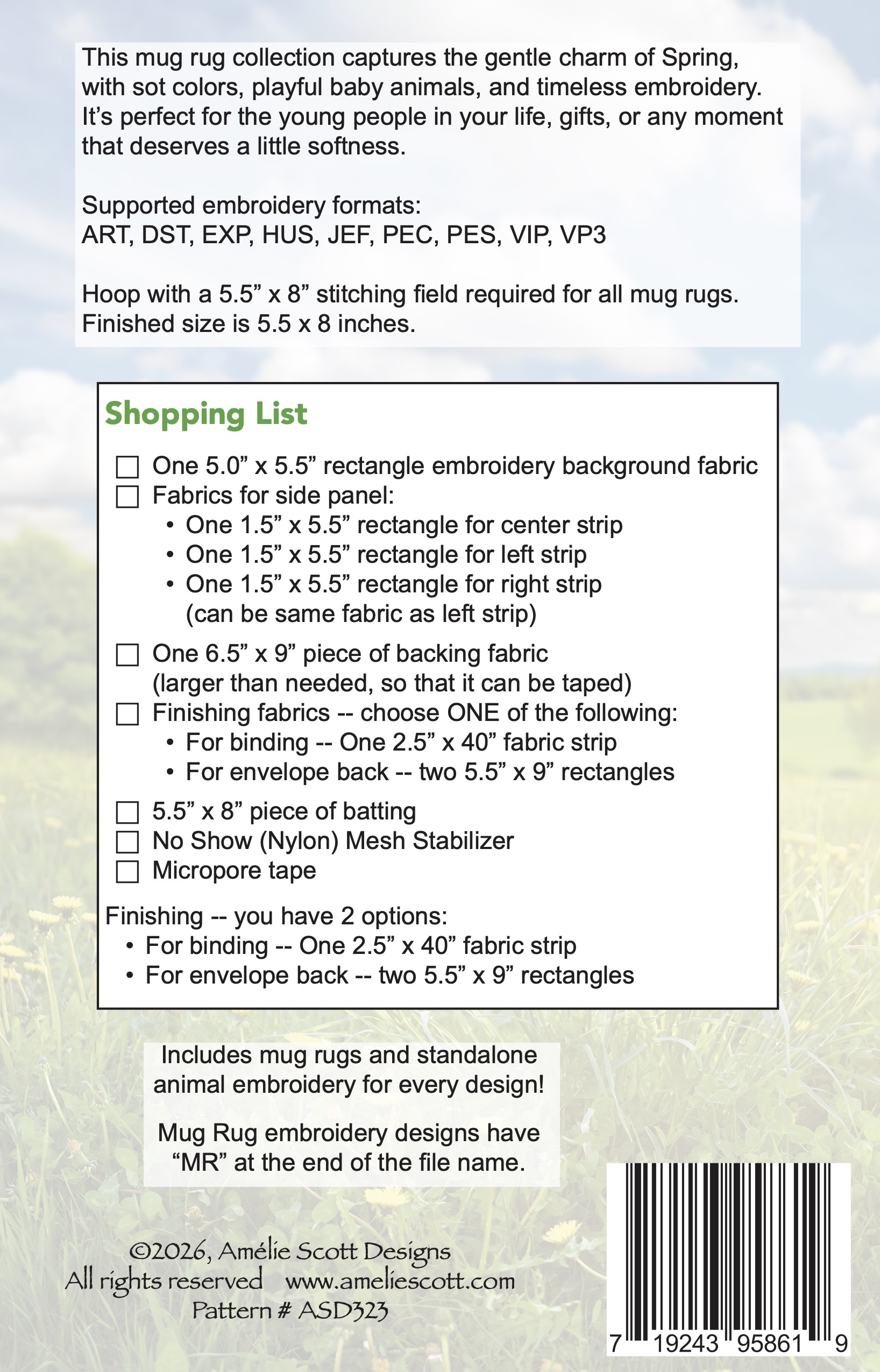 Hoop with a 5.5” x 8” stitching field required for all mug rugs.